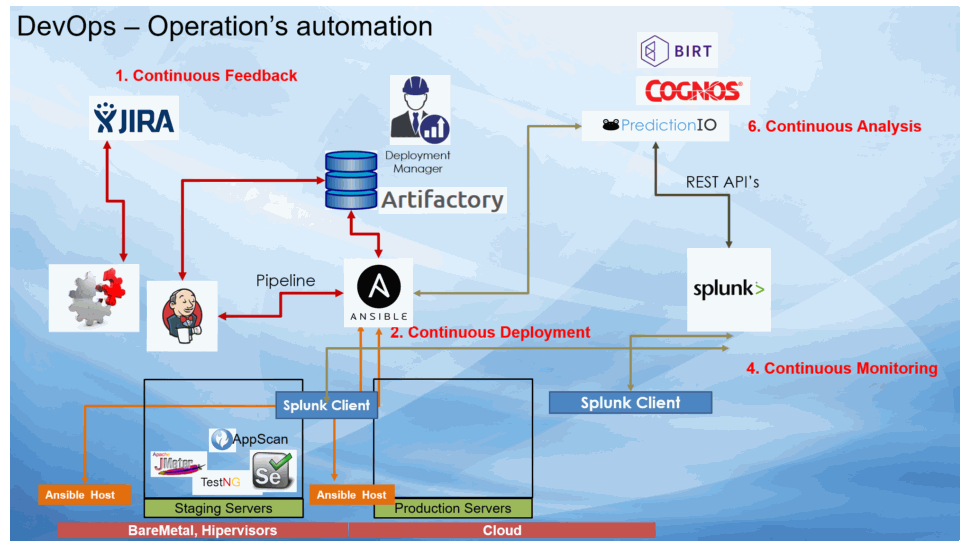 Rather than the traditional waterfall method with software development, testing and deployment, DevOps encourages a more rapid release cycle with a continuous introduction of new features, continuous testing and continuous deployment.